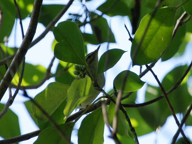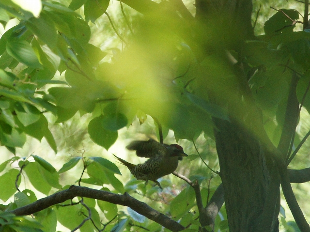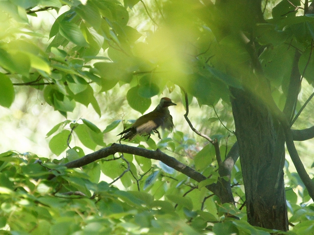 - 昼食後、高台に登ると間近でアオゲラの声、「どこどこ」と一同大いに盛り上がる。私も何とか見えました。キツツキらしくない横枝にとまる姿でしたが、贅沢を言ってはいけませんね。