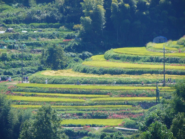 - 9月末とはいえ陽射しは強く、赤・黄・白のマンジュシャゲが咲く棚田の日蔭でひと休み、のはずが、「あのタカは何」の一声でまた空を見上げる。