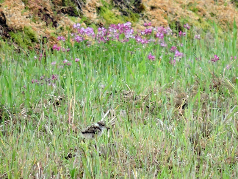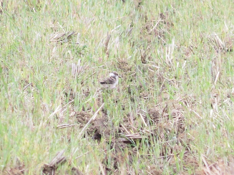 - ケリの雛はとても小さくて、親鳥は雛を守るため、近くに飛んできたツグミを追い払っていました。