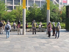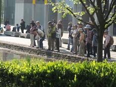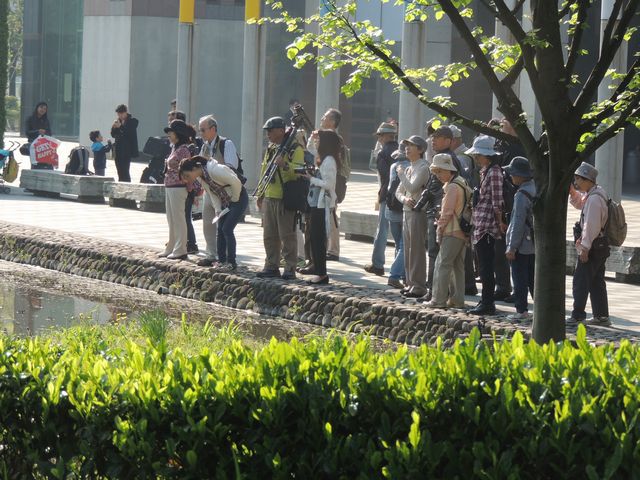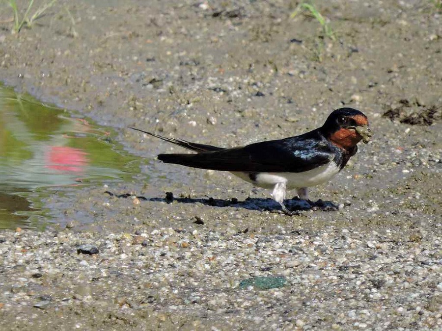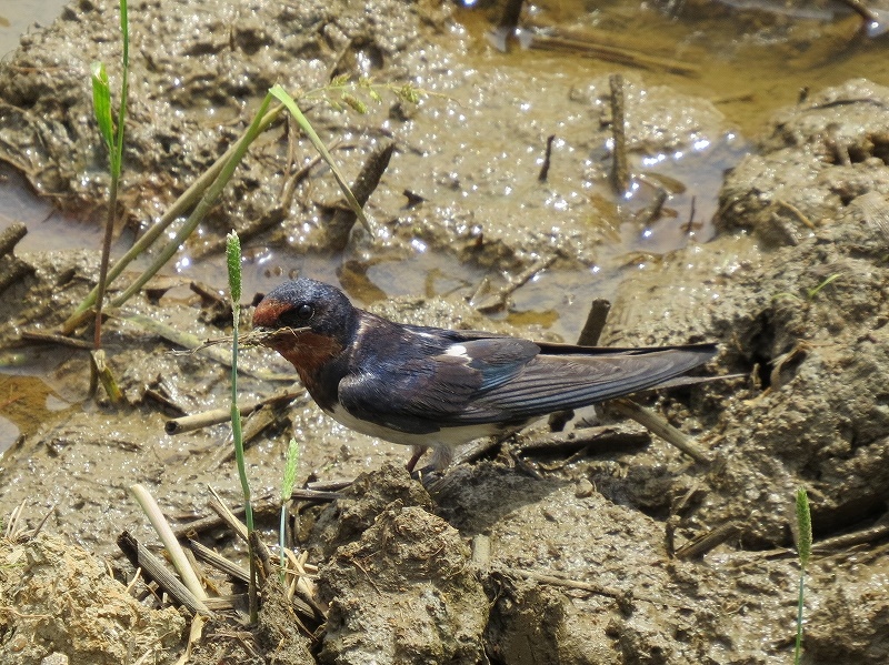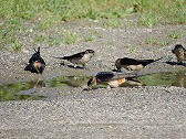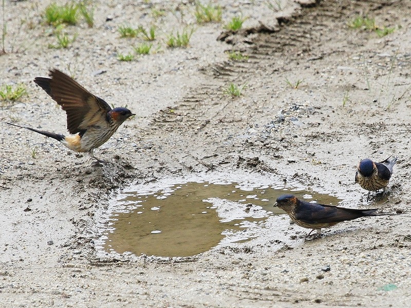 - 最後に、駐車場に残っていた水たまりの前で、少し待つよう言われました。??と思っていたら、ほどなくツバメが何羽も舞い降りてきて、歓声が上がりました。ツバメは水たまりのまわりにちょんちょんとくちばしを入れ、トコトコ歩いては飛び立っていきます。これは泥を巣に運んで巣作りをしているとのこと。ツバメが一生懸命働いているようすを見ながらの鳥合わせとなりました。初めてづくしの爽やかな一日でした。