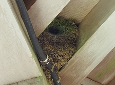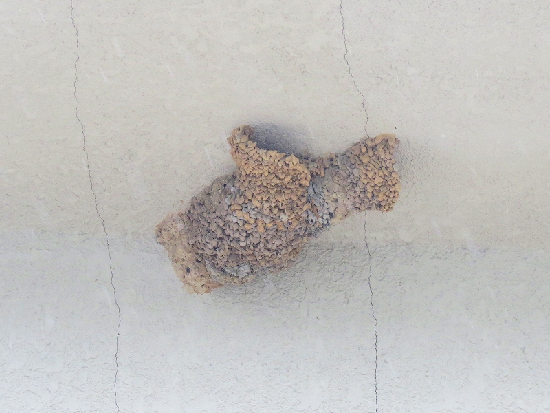 - 商店街の軒先のツバメのようすを確認、商工会館の軒下では、出入り口が二つのコシアカツバメの珍しい巣を観察。