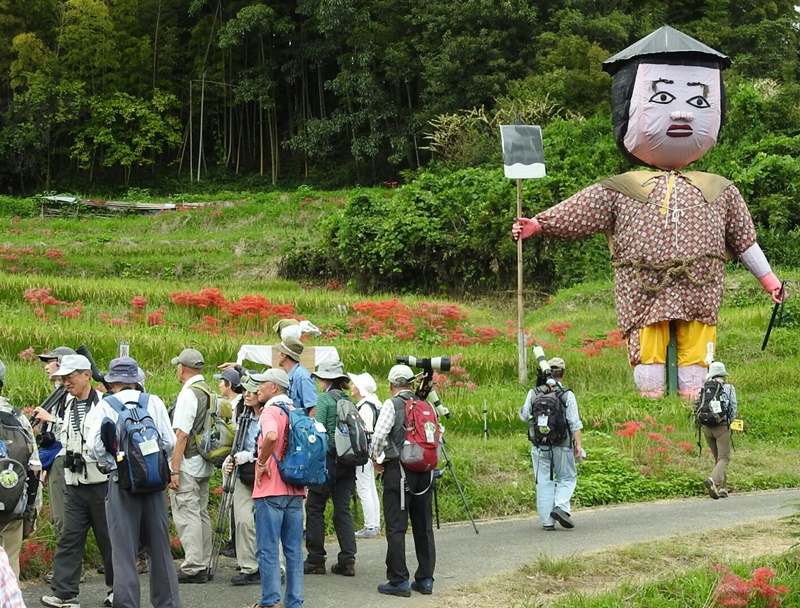 - 棚田ではいろいろな案山子があり、ヒガンバナ、絶滅危惧種のミズアオイ(水葵)が咲いていました。ススキの穂の下にはナンバンキセルの群生がありました。