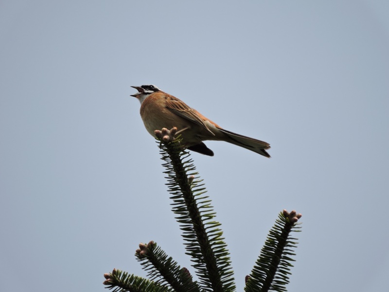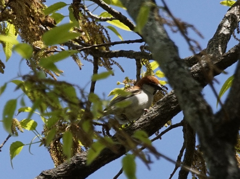 - 早速、イソヒヨドリの美声が聞こえ、雄同士の追いかけっこが ? ? ? ?。 開会の挨拶が終わるとコムクドリが出現、96の瞳が一方向へ集中、若葉が増してきて全体の姿をなかなかとらえられない。しかし、幸先の良いスタートである。