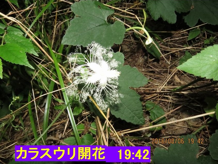 - 終了後は定番のカラスウリの開花、ねぐら入り観察前に確認したつぼみが、帰りにはレースを広げているのを確認した。