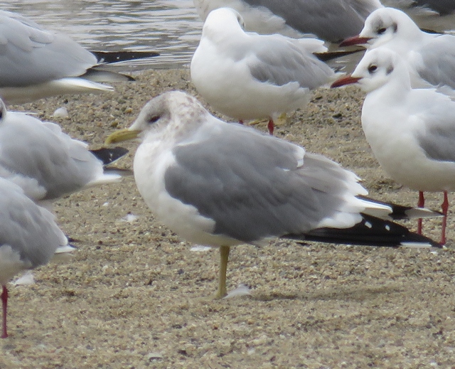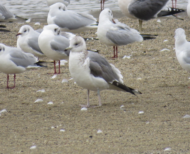 - カモメ初心者の方には、まずウミネコの成鳥(2羽しかいなかった)を見てもらい、その後、カモメ、ユリカモメ、セグロカモメの基本3種の成鳥と若い個体(ユリカモメは第1回冬羽、カモメは第1,2回冬羽、セグロカモメは第1〜3年冬羽)の識別にもチャレンジしてもらった。