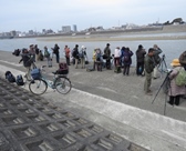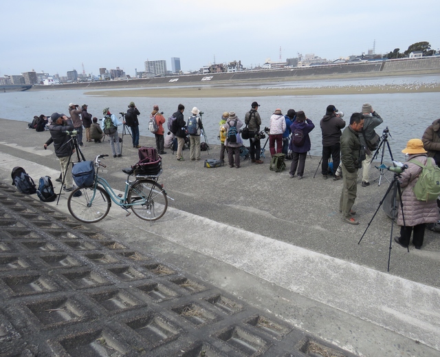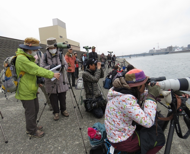 - 啓蟄らしい暖かな天候の下、40名を超える参加があった。七道駅からカモメたちの群れる中洲に直行し、川岸から群れを観察した。