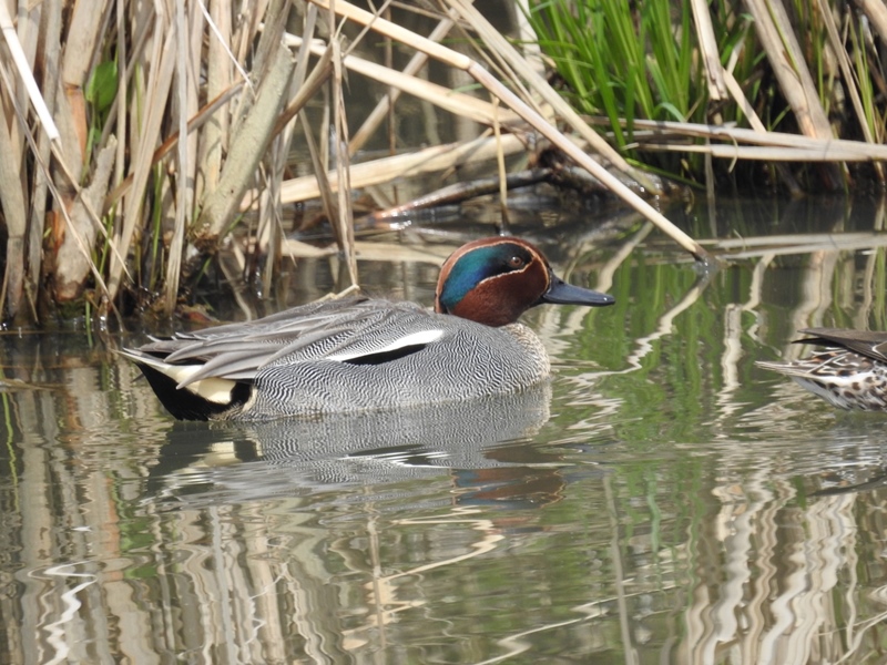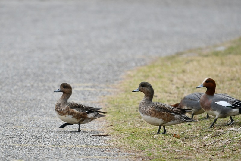 次の和田池では、コガモが珍しく池の干上がった場所で集団で歩いていました。思ったより足が短く、よちよち歩く様子がとてもかわいかったです。