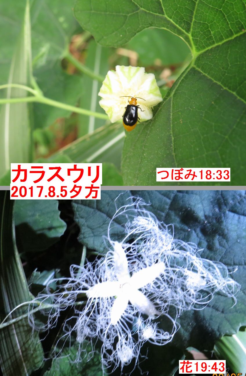 尚、行き帰りにカラスウリの花の変化、行きに見たつぼみが、1時間後の帰りには白いレース状に伸びた花びらを観察でき、また遠くには「なにわ淀川花火大会」の花火が遠望できた。