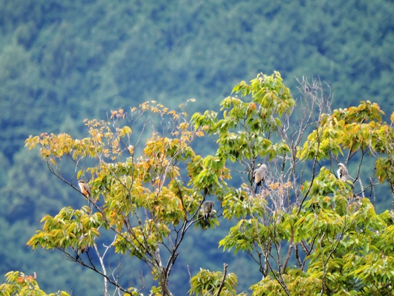 公園内では、イカルの群れが梢で休んでいるところにモズ雄が乱入したものの、イカルたちは平然と羽繕いを続けているところを観察しました。北西の農地では、渡ってきたばかりのノビタキ3羽を確認。昼食後、葛城山麓公園を出てすぐ、サシバ6羽がタカ柱を形成。