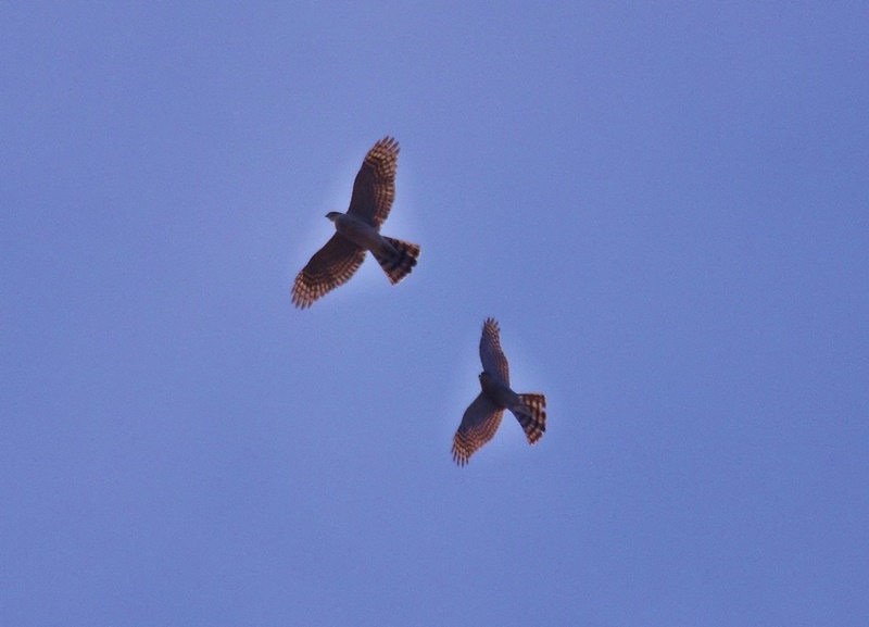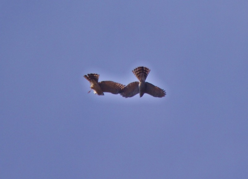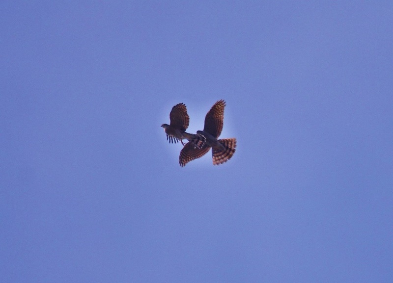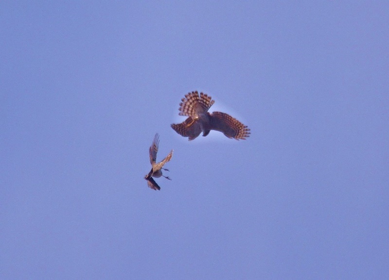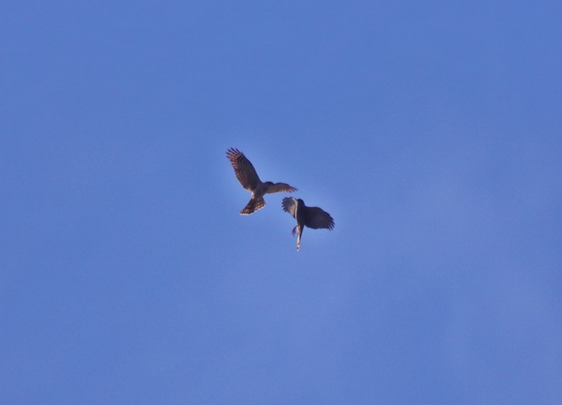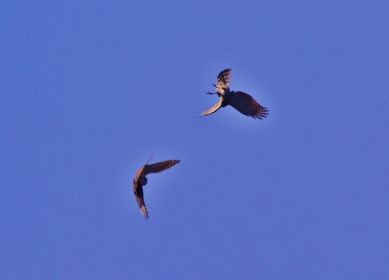 またチョウゲンボウのオス・メスを同時に見ることが出来ました。暫く上空を飛んでいましたが、そのうちあるお宅の家のひさしに向かい合って留まりました。まるでお見合いをしているかのよう。その光景に何だか微笑ましくなり、見入ってしまいました。