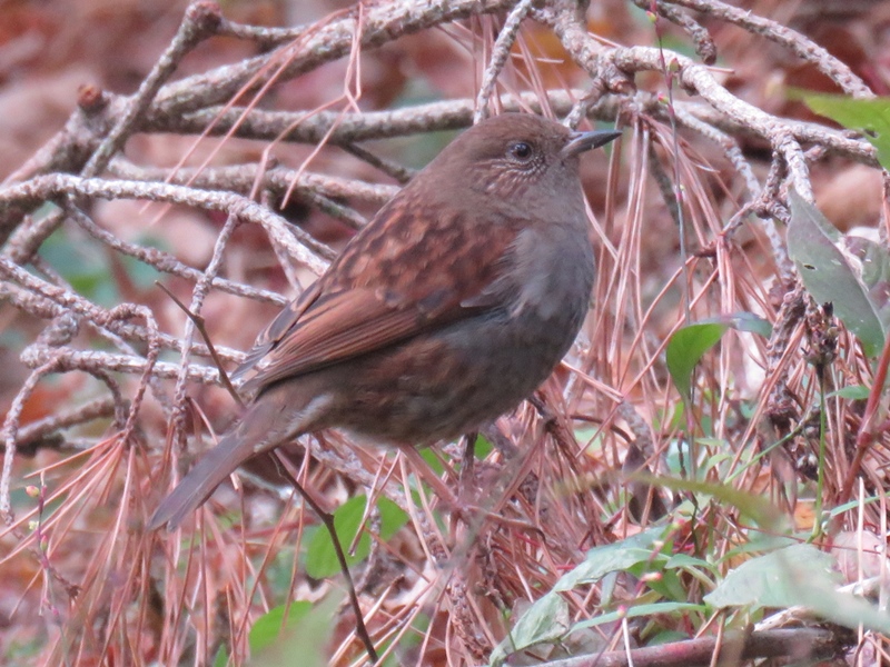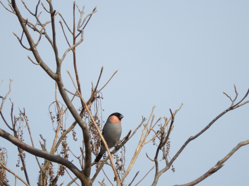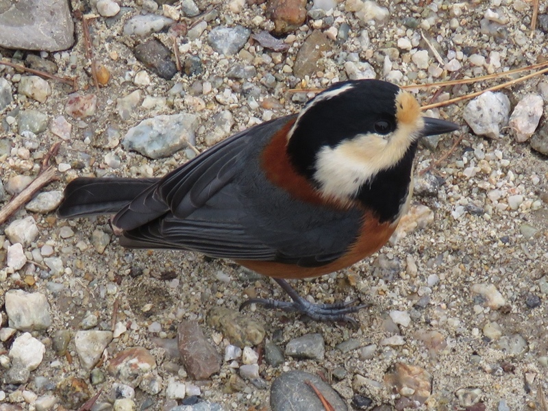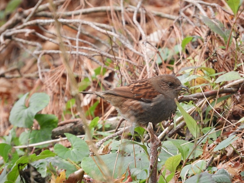 午前中、鳥の出は少なめでしたが、カシラダカや少し遠くで木の実をついばんでいるウソなどが観られました。昼前にキャンプ場とピクニック広場の間を行き来するカヤクグリに出会いました。カヤクグリは鈴のようなかわいい声で鳴いていました。もっとカヤクグリが観たかったので昼食後キャンプ場の方に降りると、地面で餌をついばむカヤクグリを近くでじっくりと観察することができました。さらに、ピクニック広場から喉の紅色が美しい雄のウソをじっくりと観ることもできました。