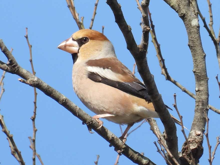 昼食の豊浦側休憩所では、イカル・シメ・モズ・ジョウビタキを間近で確認。川原側広場では、アオバト雌がクヌギの梢に飛来、嘴の色や下尾筒の模様をじっくりと観察。