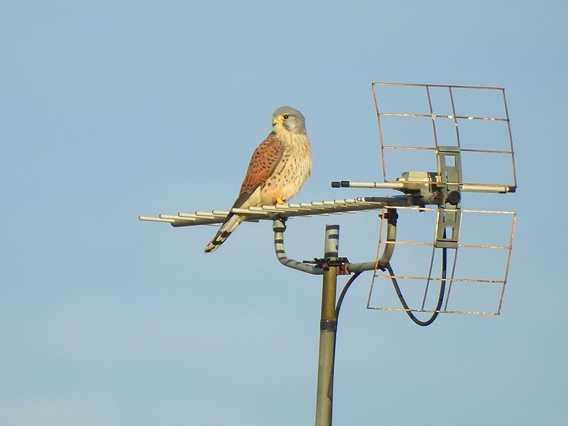住宅地の電線にカワラヒワ、テレビアンテナにジョウビタキ、工業団地のセンダンに群れるムクドリなどを観察。