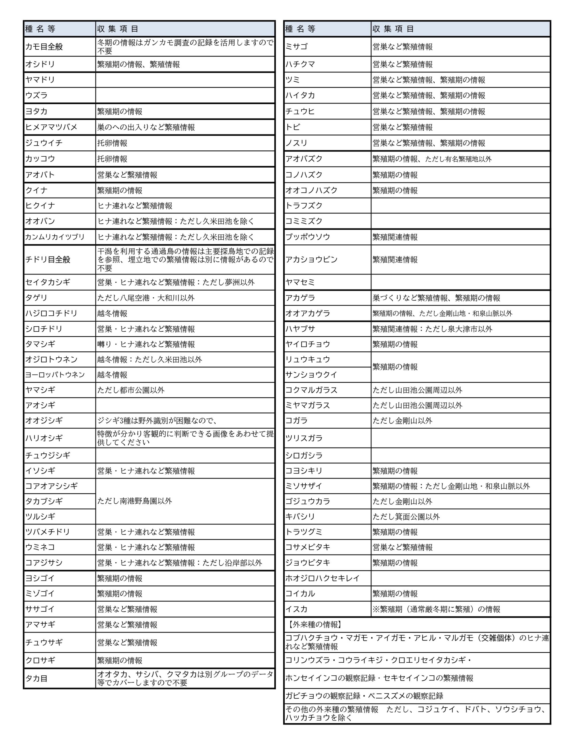 下の表にあげた種について重点的にデータ収集を行います。 表中の収集項目の空欄のものは観察記録全般、見たという記録だけでもお寄せいただきたいものです。 ※表に記載のない鳥についての情報提供も受付ます |
