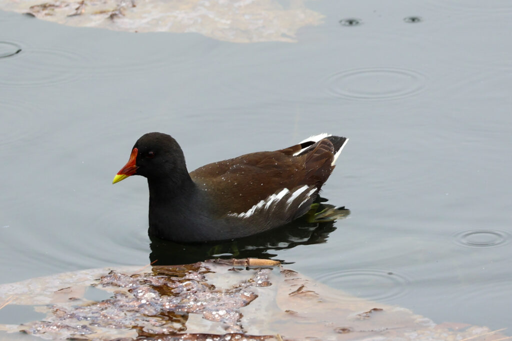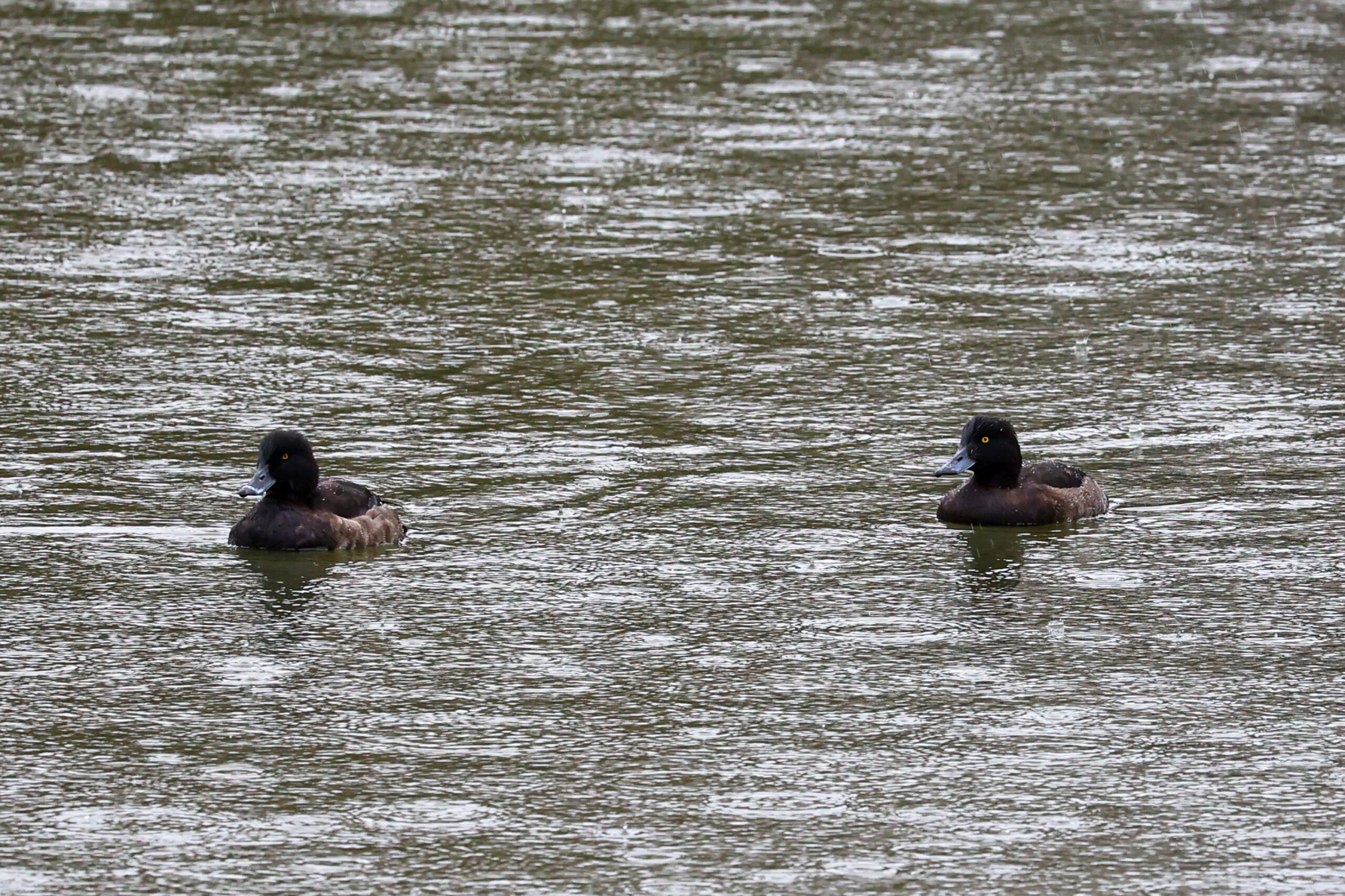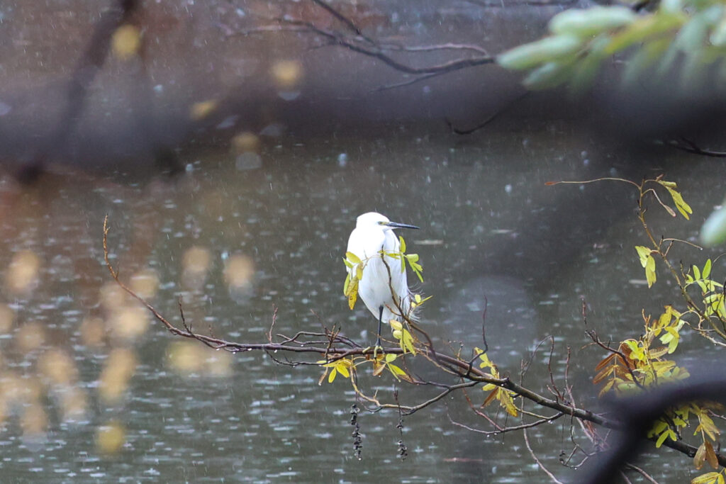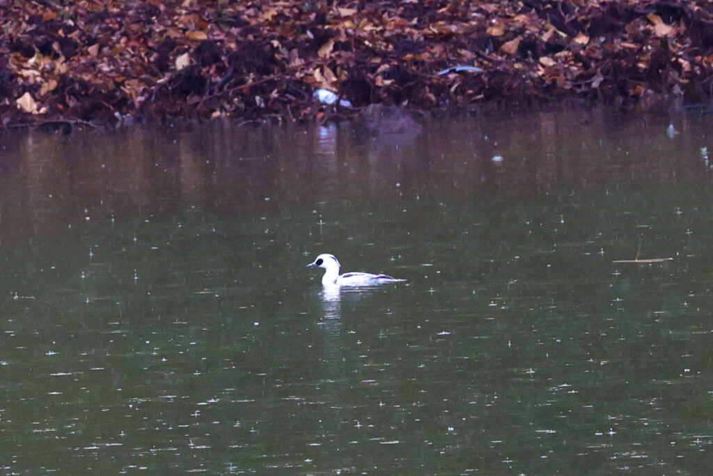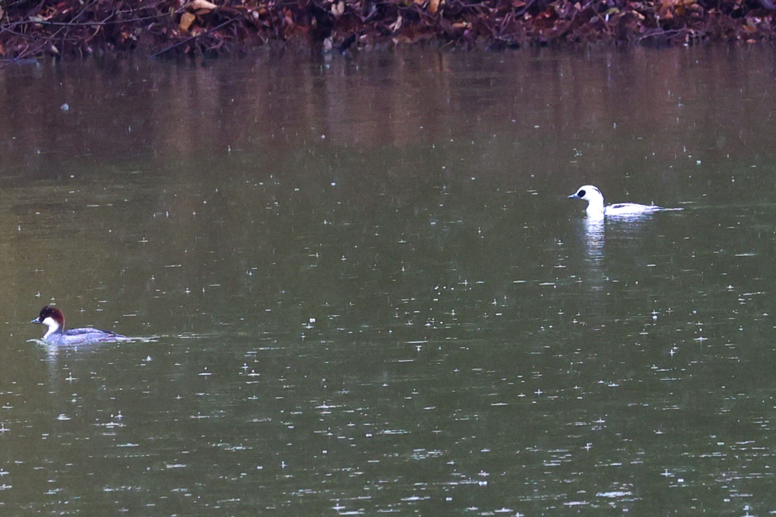 あいにくの雨の中、参加者10名、リーダー5名、総勢15名でスタート。新宮池でカルガモ・ホシハジロ・キンクロハジロ・ミコアイサ、アオサギ・コサギ・ゴイサギ、バン・オオバン、カイツブリの水辺の鳥、ツグミ・ジョウビタキなどを観察。山ケ池では、新たにオカヨシガモ・ヨシガモ・オナガガモ・マガモを観察。対岸のクスノキにアオバト5羽が飛び込むところ、うち1羽が梢に止まったことを確認。早めの昼食休憩後、雨が止む気配がないため、ルートを短縮してユースホステル跡を経由して、うずわ池へ。ミコアイサ雄の姿、カワセミの姿を間近に観て、予定より90分早く切り上げ。38種を確認。