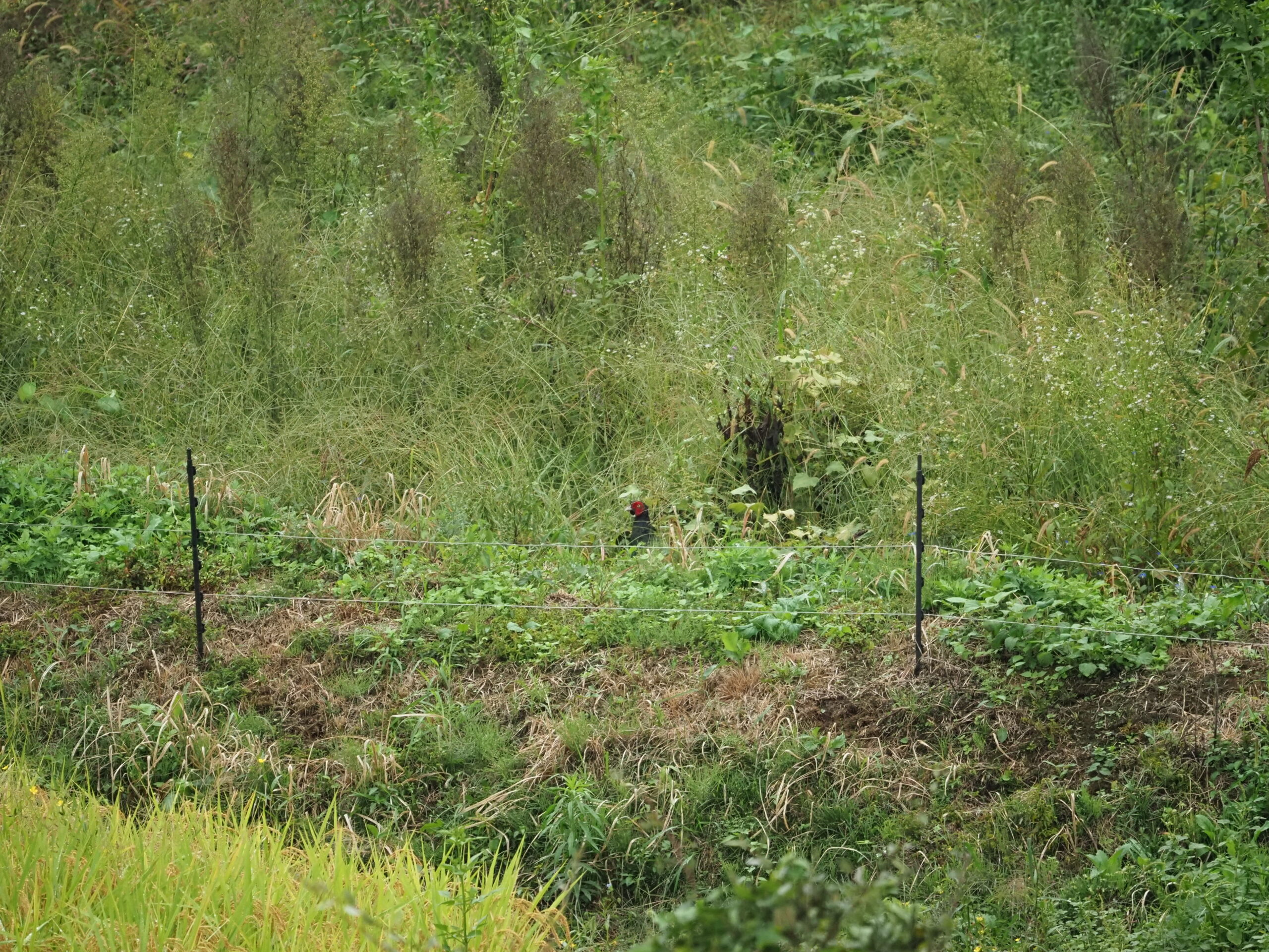 高松塚古墳の近くの農耕地でキジのオスが羽繕いをしてくつろいでいました。鮮やかな赤い顔と後ろ姿で尾羽を広げて見せてくれました。とても美しかったです。じっくり観察した後、少し場所を変え再び見てみるとキジが身をひそめて顔だけが見えました。上空を見ると猛禽類のサシバが空高く飛んでいました。そのときキジはどうしてるか気になり見てみると、身をひそめ隠れて上空を見上げていました。