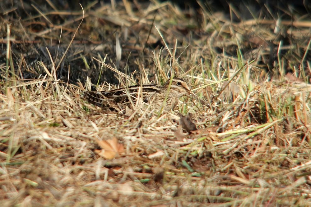 今日のトピックスは探鳥会資料に入れたタシギ、先月観察した水すましの池上流側で草が刈り取られていたためいなくなったと思っていたが、草刈りあとの中にいることがわかり、その内エサ探しに動き始めたので全員でゆっくり観察できた。タシギの羽の色模様が草刈り跡ではカモフラージュされる保護色であることがわかった。