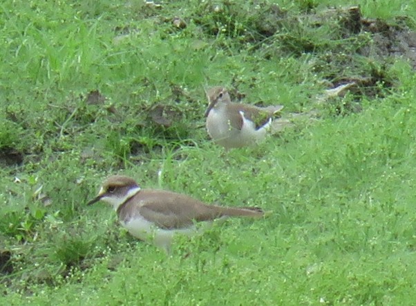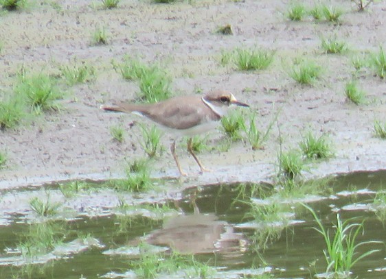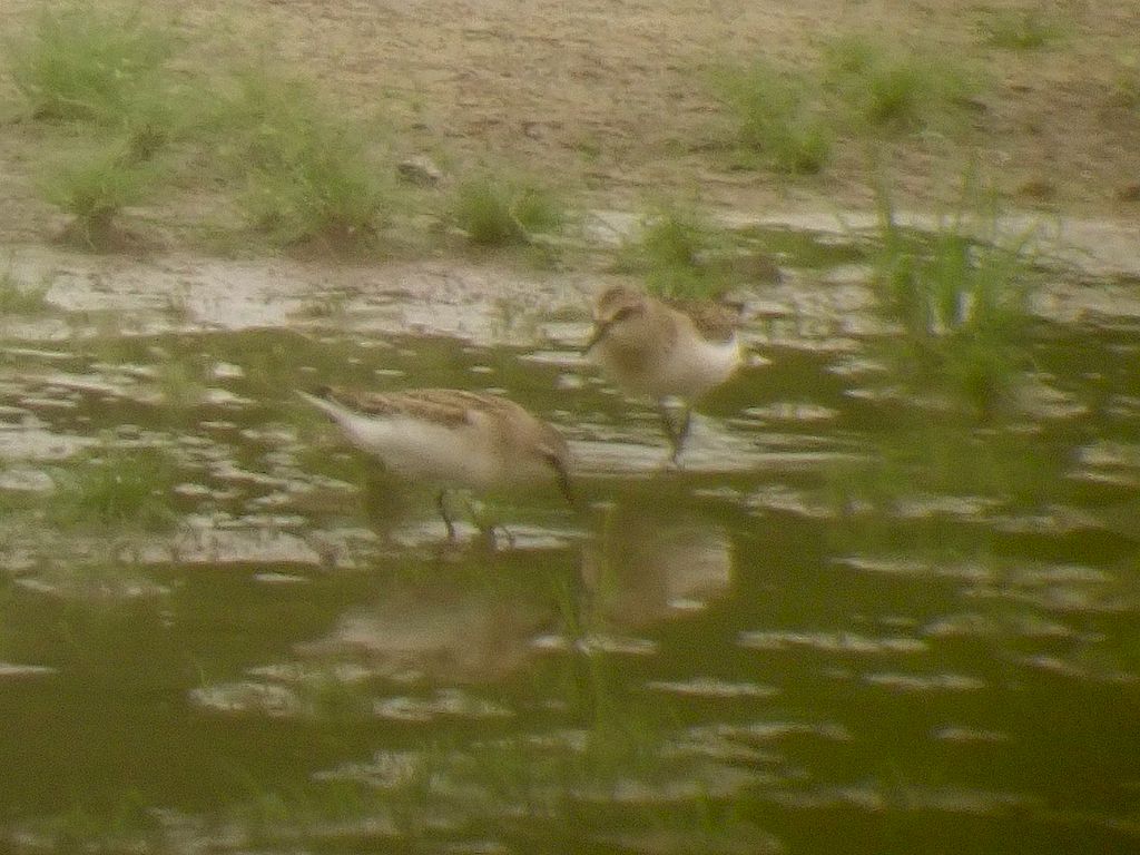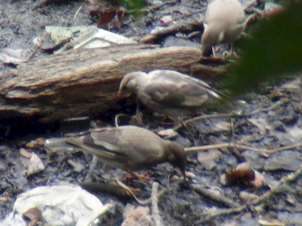 おっっ、中池は水がぐっと引いていますな。そして、いるじゃないですか、チドリ類!それにイソシギも!今回は旅鳥を待ったり、雨宿りもして、かなり時間が押しているので、省略の予定だった若竹池でしたが、これをちゃんと見るには、向こうまで行くしかない。ということで、水際が少しばかり近い南側からの観察で、どうやらチドリはすべて、コチドリでなくイカルチドリと判明。翼も開かないしアイリングもあるような、ないような、幼羽か冬羽の地味なタイプが多かったのですが、イソシギより一回り大きく見えるのが決め手となりました。手前の水面には、まだ色がでていないコガモ3羽も登場。岸辺では先ほどから50羽ほどの群れで行動しているムクドリが、泥面で何かの餌をついばんでいますが、幼羽から換羽中の個体は、まだらに黒い新羽が混じって、一瞬、珍なムクドリを期待させてくれました。高川では見損ねたハクセキレイにキセキレイ、それとカワセミも登場。お昼も近い終盤に、立て続けに現れる鳥たちに軽くパニックになったところに「トウネンがいる!」の声。なんと、澪筋のあたりに、都合3羽も入っていました。