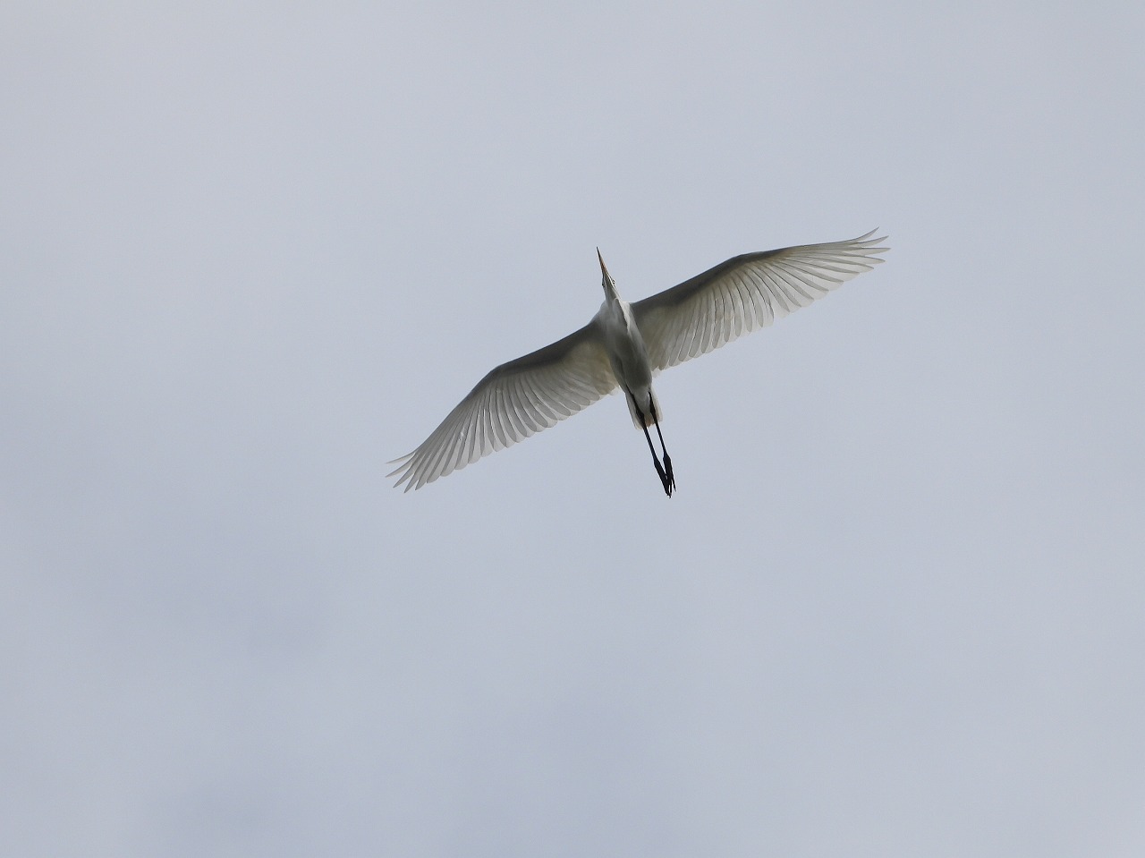 道路を渡って、さあ、さっきのダイサギはどこ?と、うずわ池を見渡しますが、サギどころかカイツブリもカワウも、カルガモも不在の、無機質な・・・いや、有機物を満面にたたえた緑の水面が横たわるばかり。背後の林からは、ずいぶん遅まきのヒヨドリの巣立ち雛の、一本調子な声が続いています。ここまでに渡りの要素は一切なし。切なる期待とともに、いなり山の坂道を登りますが、ポイントの子鹿橋付近の桜並木もすっからかん。ここはまあ、例年こんな感じだわ、と思えてきたのが悲しい。 メジロでも居ればいいかな、と尾根筋のコナラ林に入りますが、ただ歩き抜けるしかない静けさ。林内いちばんの下の広場で、もういいかな、というぐらい待つ無駄なあがきをした甲斐もなく、林を出ようと動き始めたその時。林内をスポーンと抜けてきた小鳥の影が、見える枯れ枝にピタリと止まりました。スコープに納めると、待ってました、コサメビタキ!ウンともスンとも言わないで林内を飛んできた鳥が、よくぞ見つかったものです。しばらく落ち着いていてくれたので、多くの方に観察していただけました。まずは渡り鳥、1種ゲット!