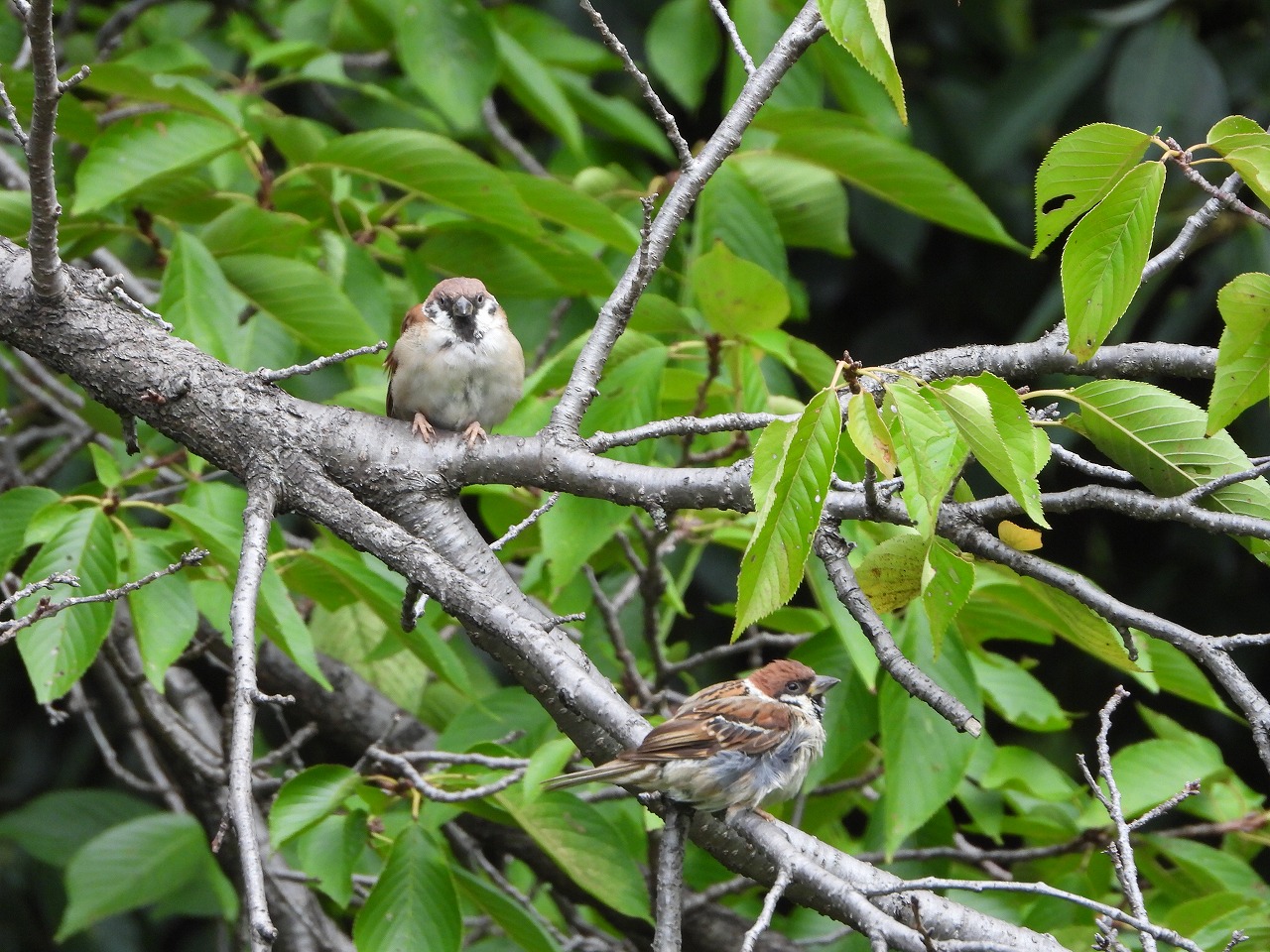 雨はじきに上がって、円形花壇へ向かいます。途中、よく低い枝にコサメビタキがとまっている桜広場に2匹目のドジョウならぬヒタキを探しますが、叶わぬまま円形花壇に到着、トイレ休憩です。ここにもスズメたちの小群が飛来。今日の主役は君たちかも、と思える意外な存在感をかもします。