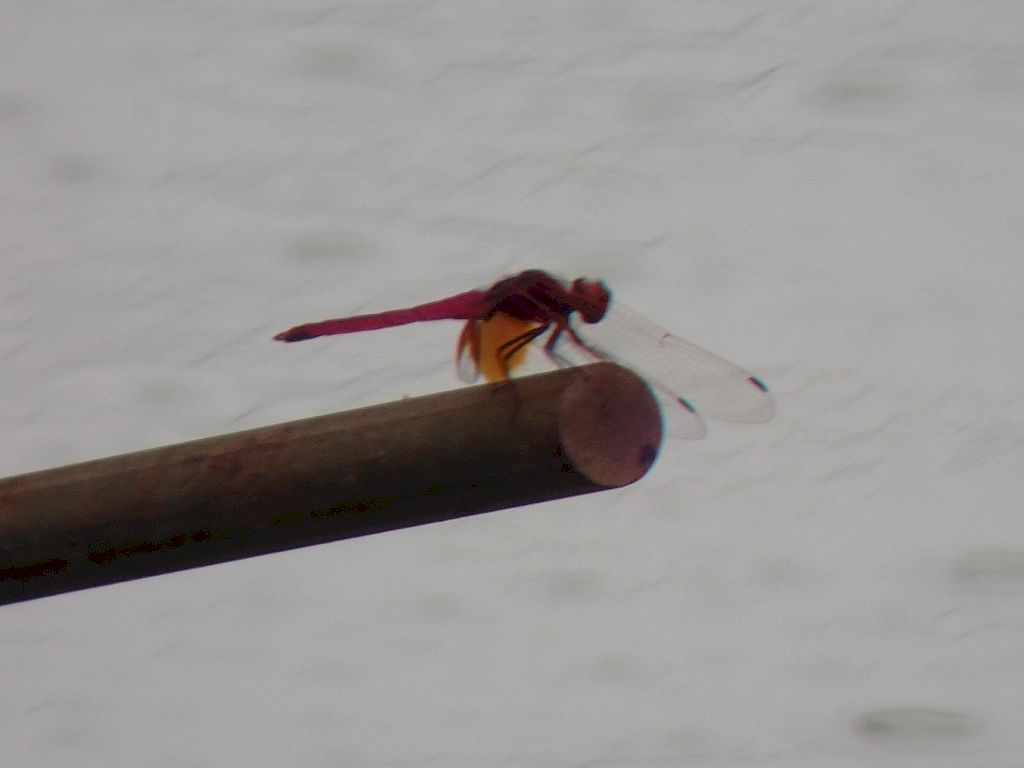 高川に降り着いても、前日の雨の余韻で増水気味の川面に、セキレイ類の姿は見えません。あれ、しかし、目についたのは、やけにスレンダーな紅いトンボ。何かなぁ、と即時にご紹介はできませんでしたが、帰って画像を補正すると、やはり!分布をどんどん北へ拡げている南方系のトンボ、ベニトンボでした。後で事情に詳しい方にお聞きすると、服部緑地一帯はすでに、ベニトンボに制圧されているんだとか。