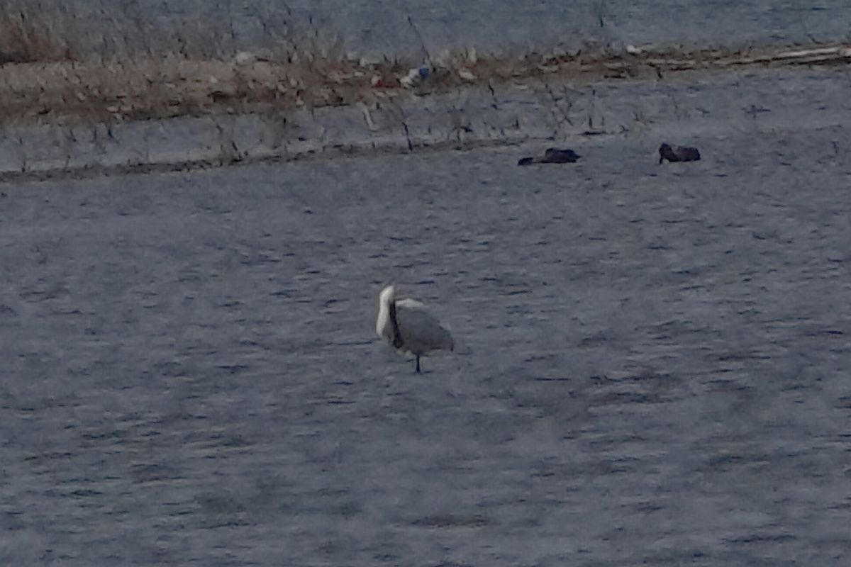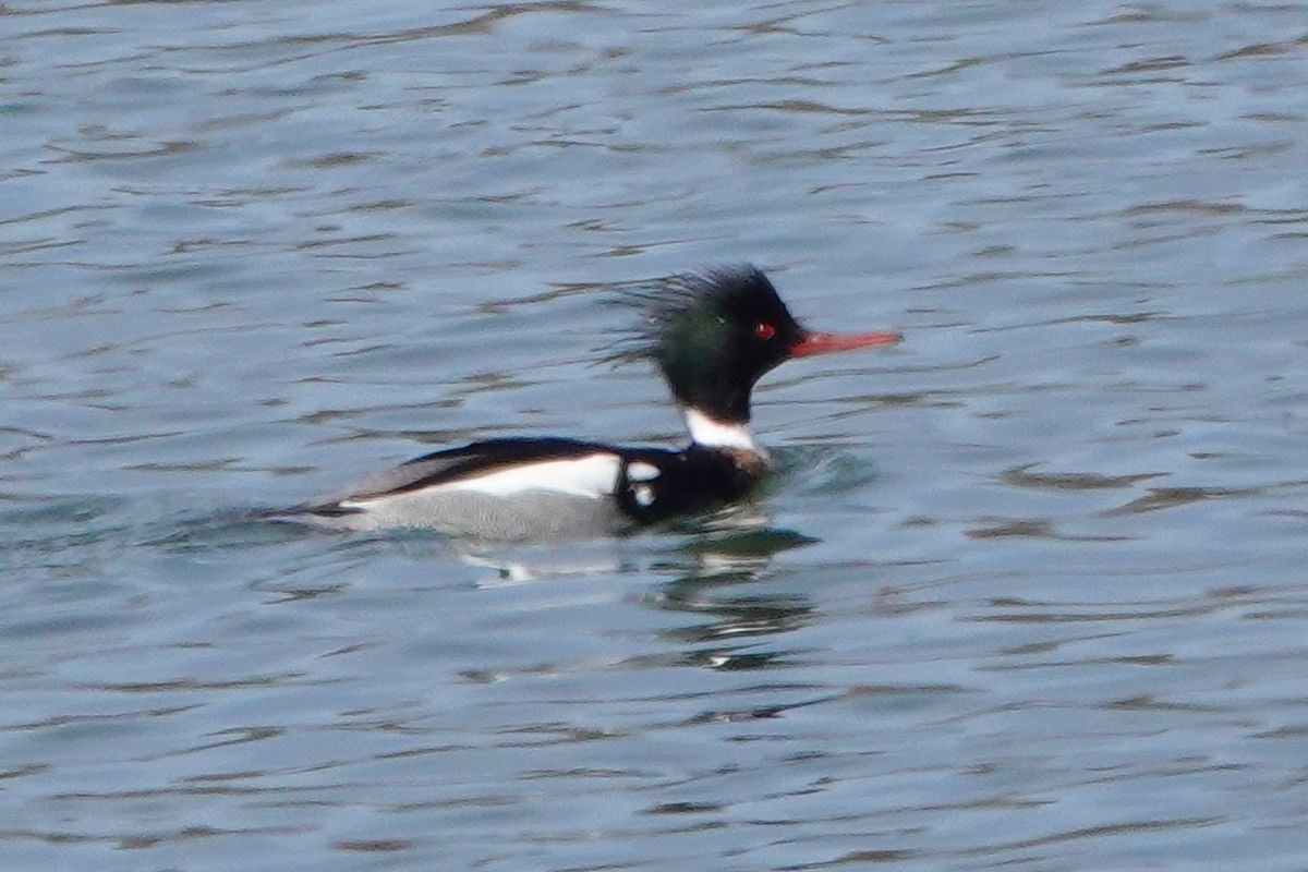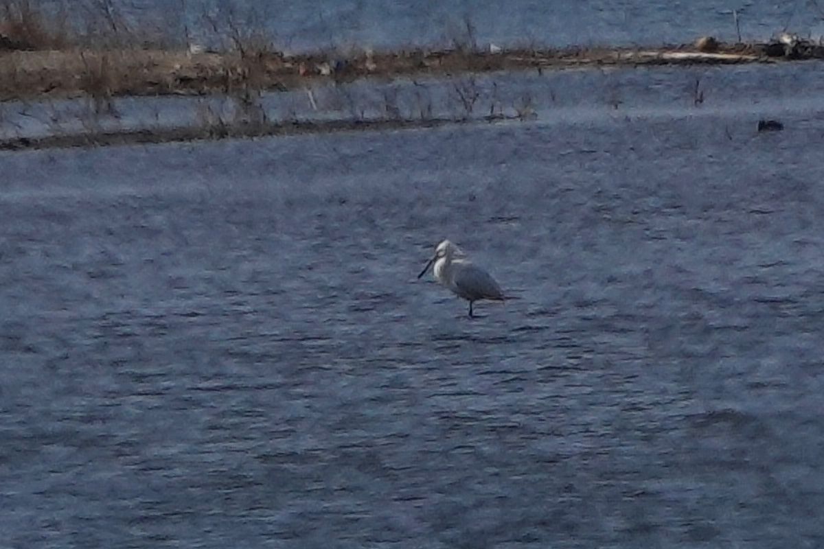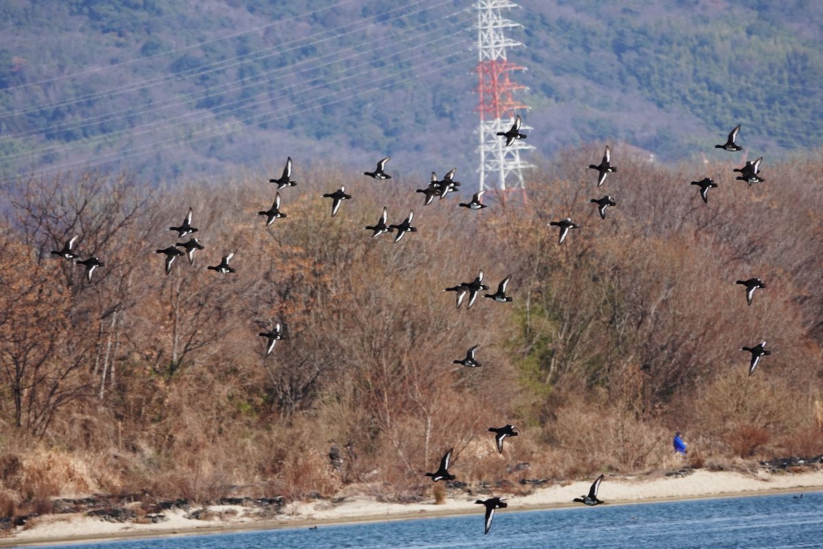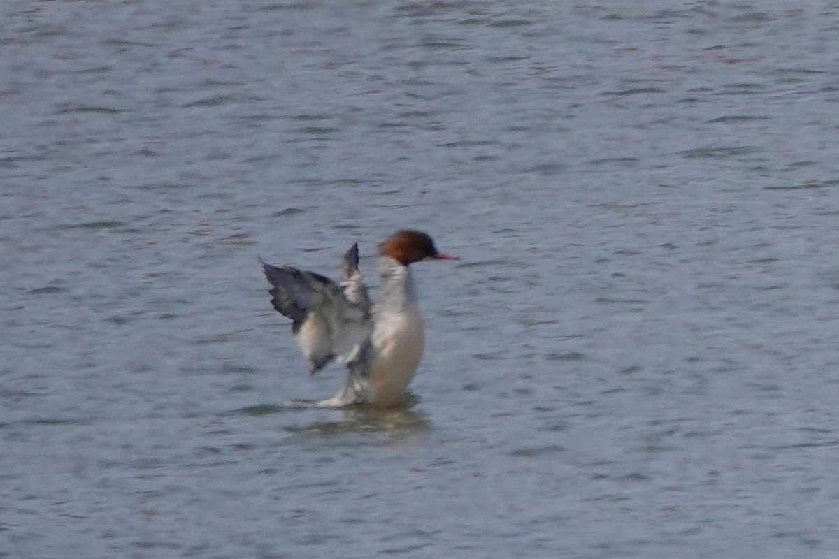 スタート前に関医タワーのまわりをハヤブサが飛んだが、スタートのころタワー周辺を飛び回ったのはトビであった。淀川本流の浅瀬には昨年(1月~3月)に続いて今年も2週間前から渡来していたヘラサギが、ほとんど動かず休んでいた。多数のキンクロハジロ・オオバンが水面に浮き、ハイタカが上空を飛ぶとキンクロハジロの大群が遠くに移動する光景も観察できた。更に水にゆっくり浮かんでいるカワアイサの近くで潜水を繰り返すウミアイサも観察できた。河川敷の草原からは春の陽気に誘われたウグイスのさえずりが切れ目なく聞こえ、ホオジロなどの小鳥だけでなく、キジやキジバト、そしてトビの「ピーヒョロロロ」も聞くことができた。