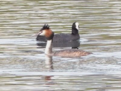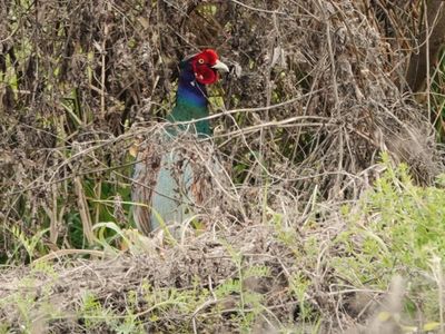 昨夜の雨が上がって快晴の鳥見日和、キジの雄たけび、ウグイス・ホオジロなどの囀りがあちこちから聞こえる嬉しい探鳥会となりました。川本流では冬鳥のカモが7種62羽、100羽をこえたオオバン、そしてカンムリカイツブリも8羽残っていた。今冬少なかったツグミも樹上だけでなく地上でのエサ探しがよく見られ50羽、シロハラ・シメ・ベニマシコ・アオジの小鳥も観察できた。