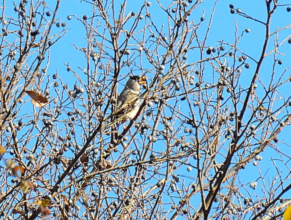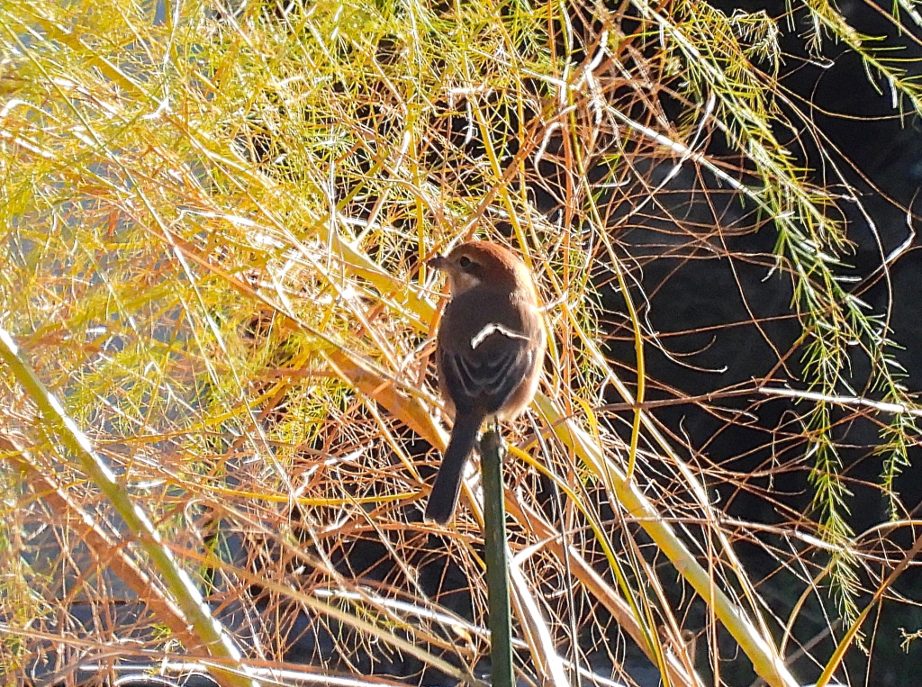 午後からも様子は変わらず棚田に出てもモズしか居なかった。澄み渡った青空に期待の猛禽類も飛ばず仕舞いで、鳥合わせでは22種と種数も少な目。それでも終日好天に恵まれ、まだ残る紅葉やサザンカの花を愛でながら今年最後の枚岡を楽しんだ。