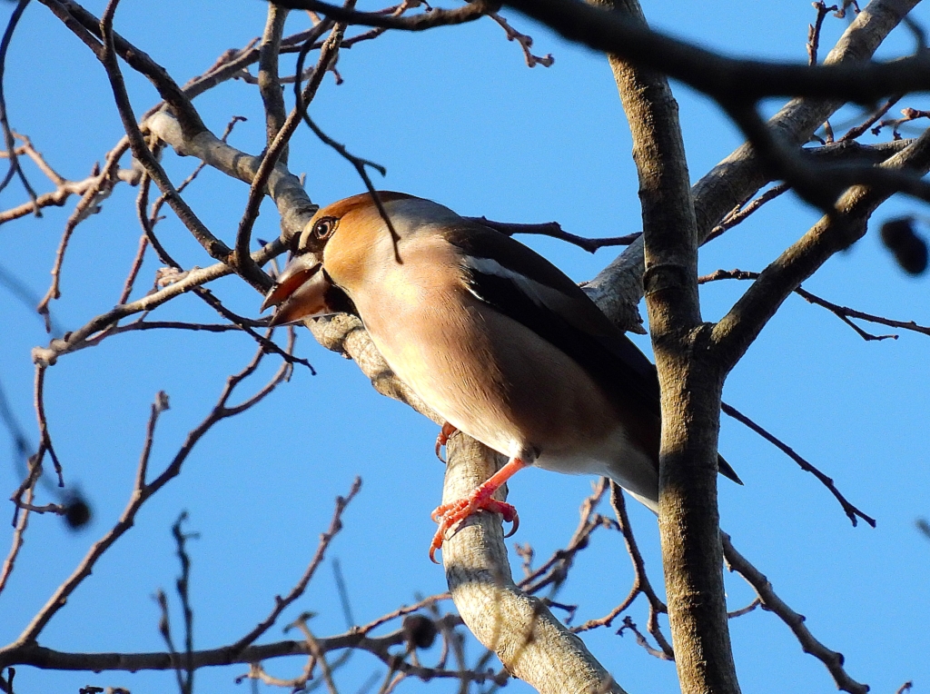 登り始めると声も姿もすっかり減り、ヒヨドリの元気な声しか耳に入らなくなった。遠くの枝で採餌するイカル数羽を確認して昼食。