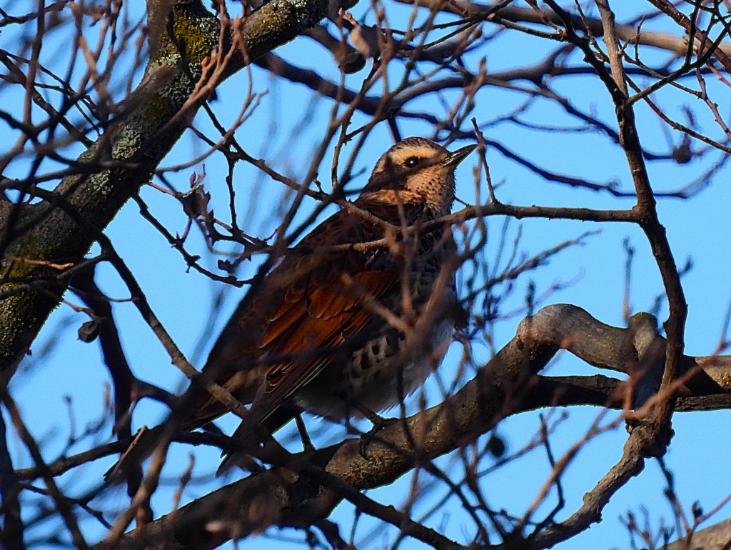 集合場所では昨年一度も出なかったシメが黙々と木の実を啄む。梅林に立ち寄るとシジュウカラやエナガ、メジロとコゲラの混群が通り過ぎた。神社横の神田ではイソヒヨドリ♂の若鳥がふっくらと身体を膨らませてこちらを見ている。すぐ横ではシロハラが珍しく横枝に止まってじっとしてくれた。桜広場に廻るとヒッヒッと声がした。スペクトルを測定するアプリからルリビタキと断定出来、便利な時代を痛感した。すぐ傍ではルリビタキの♀がこちらを気にせずポーズを決めていた。