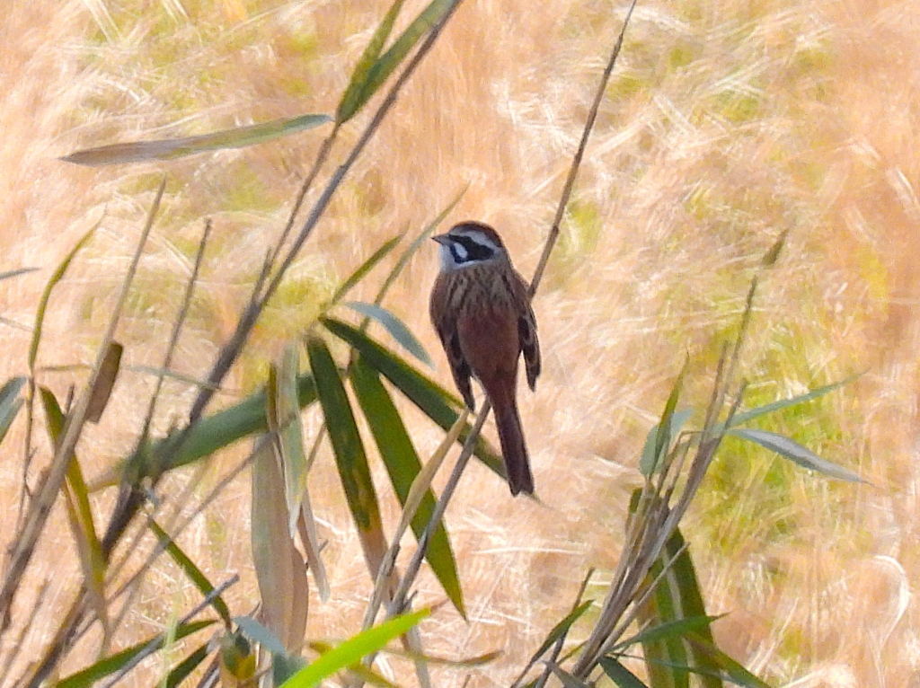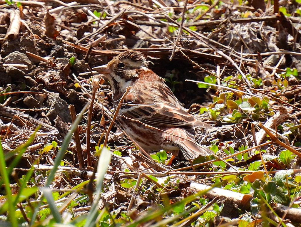 昼食後に歩き出すと、ケキョケキョと何度も発生練習をしていたウグイスがホーホケキョと今年初の綺麗な囀りを聞かせてくれ、参加者からは拍手と歓声が上がった。棚田ではモズやホオジロの雌雄識別を図鑑と望遠鏡を交代で覗きながら習得。一部の方がカシラダカも確認した。