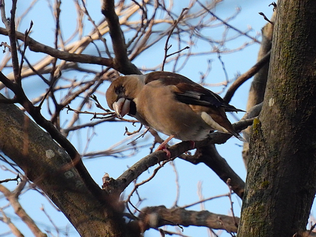 先週末の荒れた天気からは想像し難いほどの暖かく晴れ渡った空の下、初参加4名を含む32人が集まった。集合場所では陽気に誘われてかシジュウカラの囀りが聞こえ、片目を無くしたシメやイソヒヨドリの若雄が姿を見せてくれた。