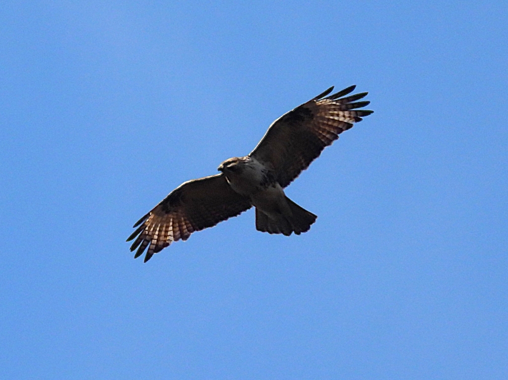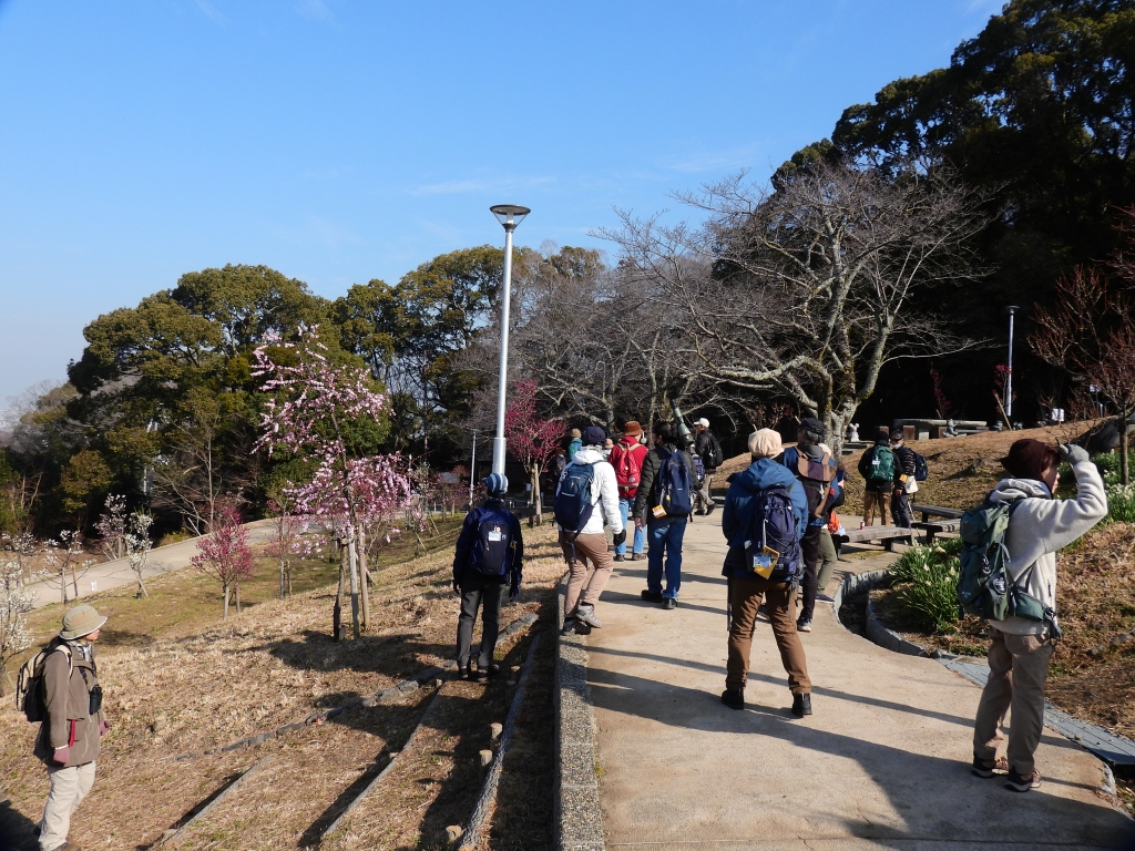 梅林に入ると5分咲きぐらいまで開花した梅やスイセンの香りに包まれ、朝から朗らかな気分になる。一部の参加者がアオバトを確認し、イカルの澄んだ声が遠くから聞こえた。川沿いではコゲラが餌を探して木を登っていくところをじっくり観察し、珍しく一部の方が川沿いの草陰にチョンチョンと隠れ込むミソサザイを見つけた。桜広場ではジョウビタキやアオジが薮の中から飛び出し、ヤマガラが近くでしきりに鳴いていた。そこから先は鳴かず飛ばずの静かな時間が続いたが、らくらく登山道で青空をバックに旋回するノスリを全員で見ることが出来た。