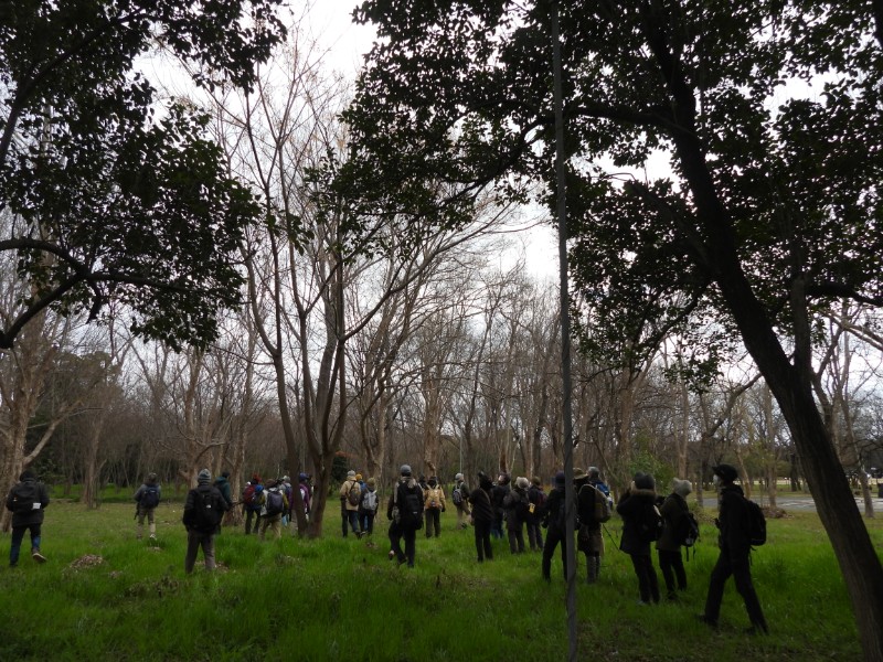 集合場所の大泉池では、カワウとアオサギが抱卵中。カンムリカイツブリとカイツブリも確認した。カモの仲間は全体に少なく、ヒドリガモ、マガモ、コガモが見られた。水流では、ルリビタキ、アトリ、シロハラ、シジュウカラ、コゲラを観察。かきつばた園では、カワセミが美しい姿をじっくりと見せてくれた。頭泉池では、カルガモ、ヒドリガモ、ホシハジロ、バン、オオバン、アオサギ、ゴイサギ(幼鳥)を確認したほか、ツグミ、アカハラ、ウグイスも見られた。上空ではトビとハイタカが飛翔した。